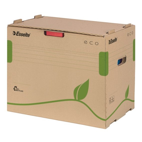 Wykonane w 100% z kartonu z odzysku; z 85% udziałem surowców pochodzących z odpadów konsumpcyjnych. Rozmiar pudeł zoptymalizowany do dokumentów A4. W naturalnym brązowym kolorze, bez użycia wybielaczy. W 100% do ponownego przetworzenia; posiadają certyfikat FSC. Nadruk wykonany przy użyciu ekologicznych farb bazujących na wodzie. Grzbiet 80 mm.
